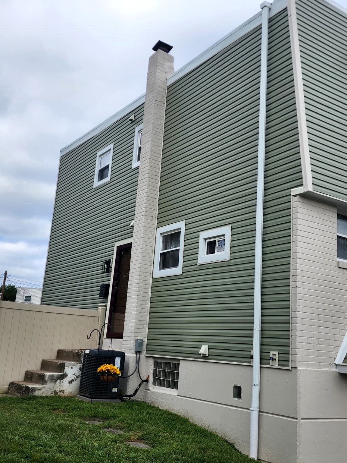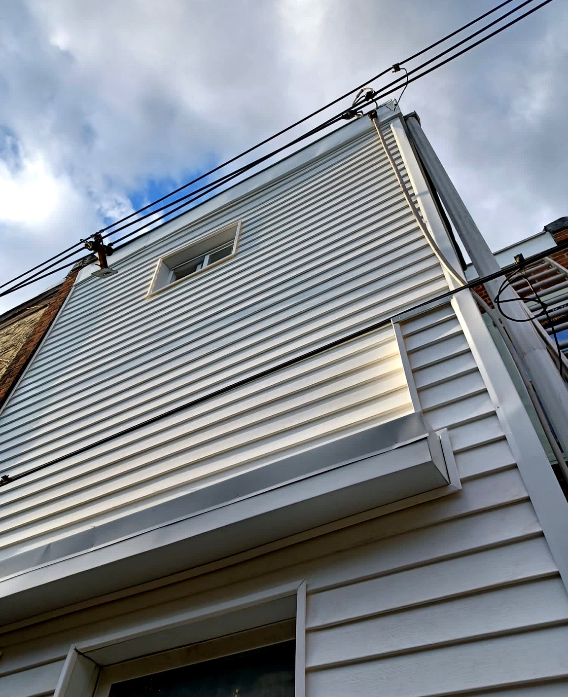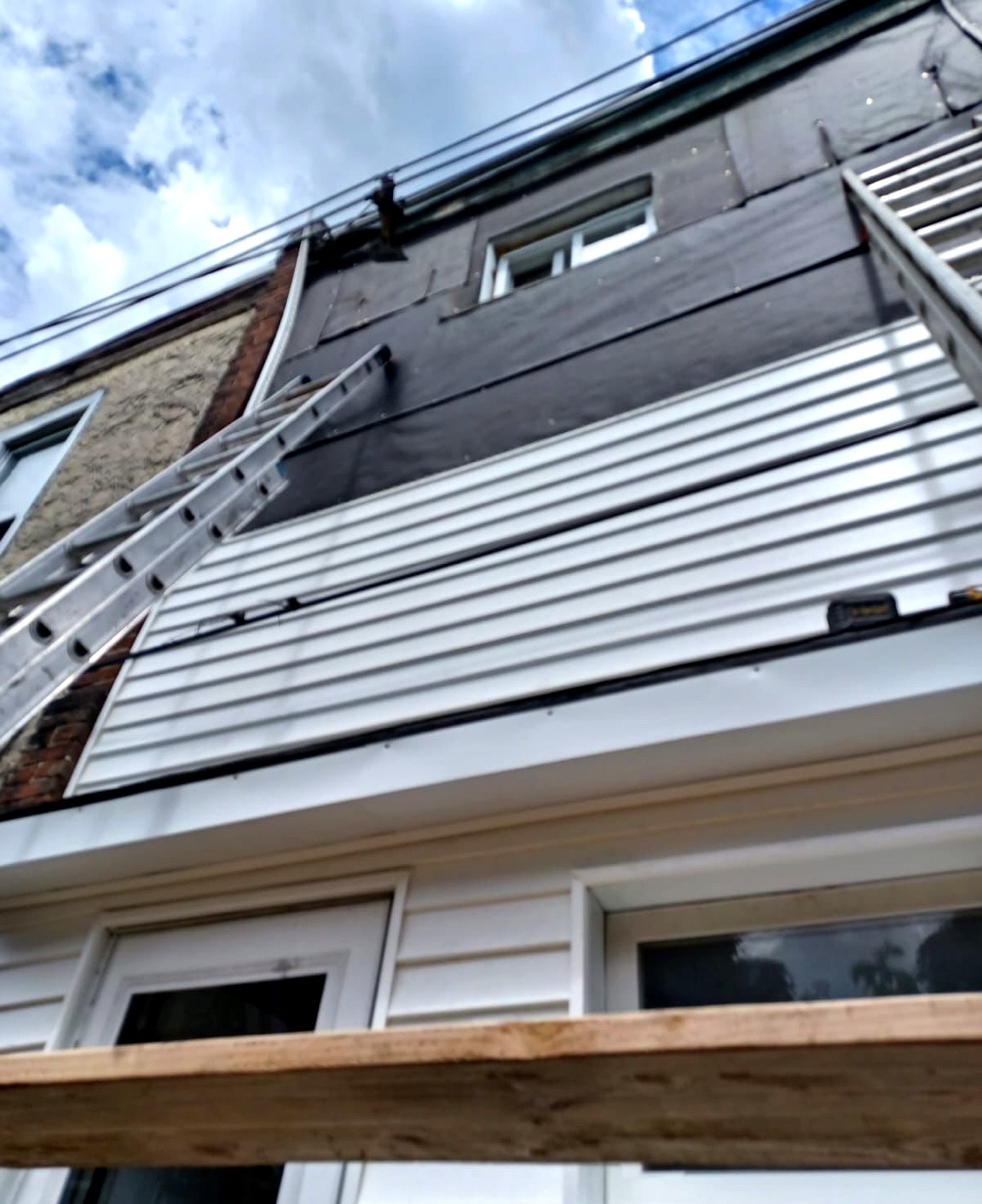 Complete vinyl siding installation on a Philadelphia row home. Removed old siding, installed house wrap and premium vinyl with clean trim detail.