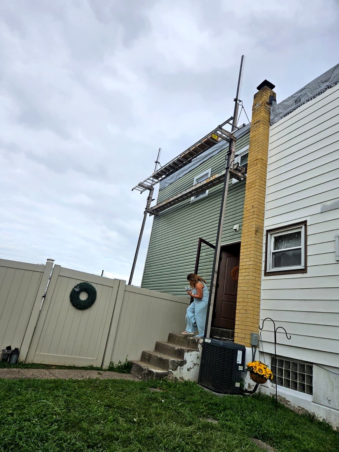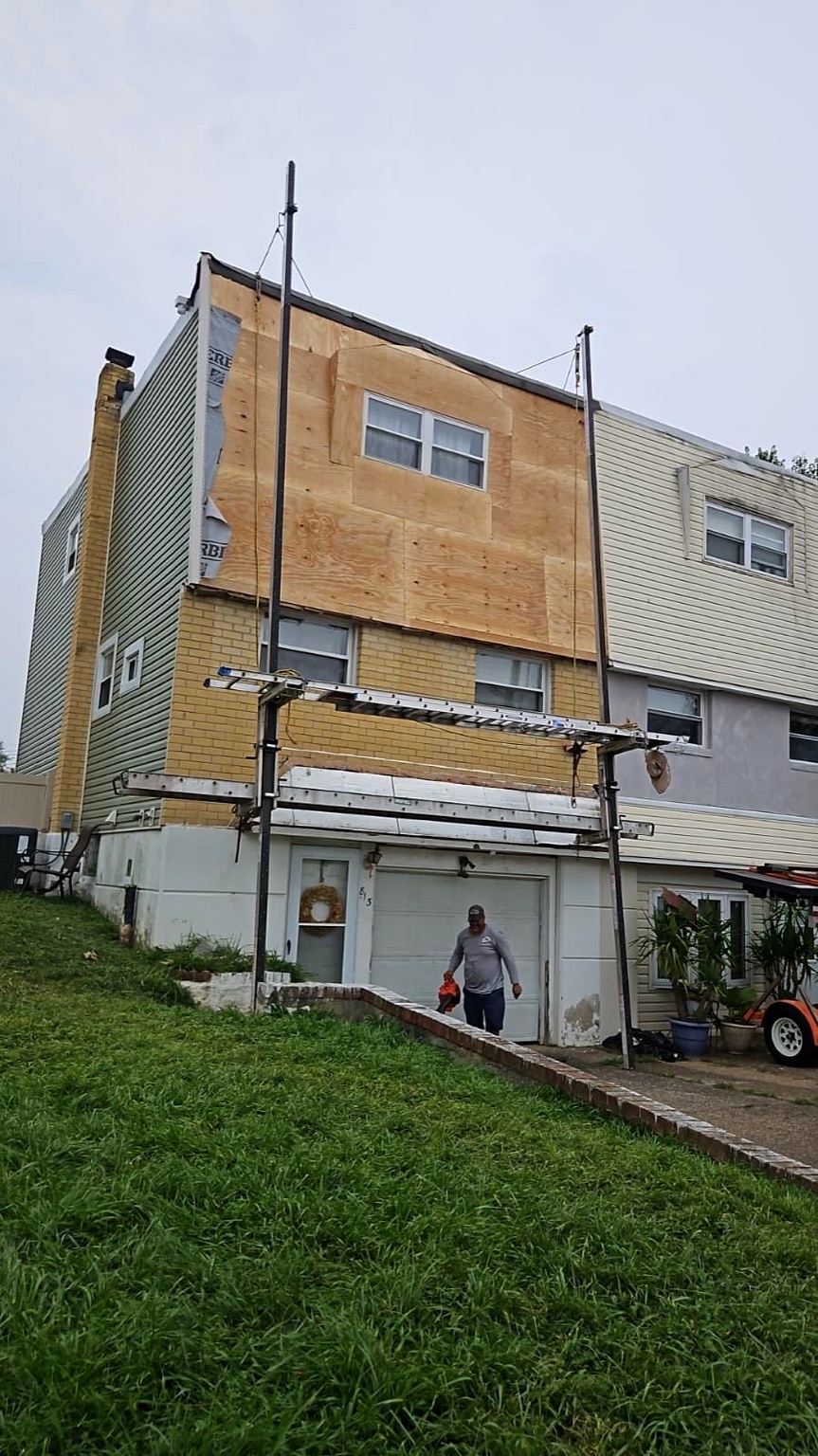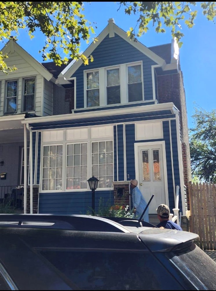 Complete vinyl siding installation on a Philadelphia row home. Removed old siding, installed house wrap and premium vinyl with clean trim detail.