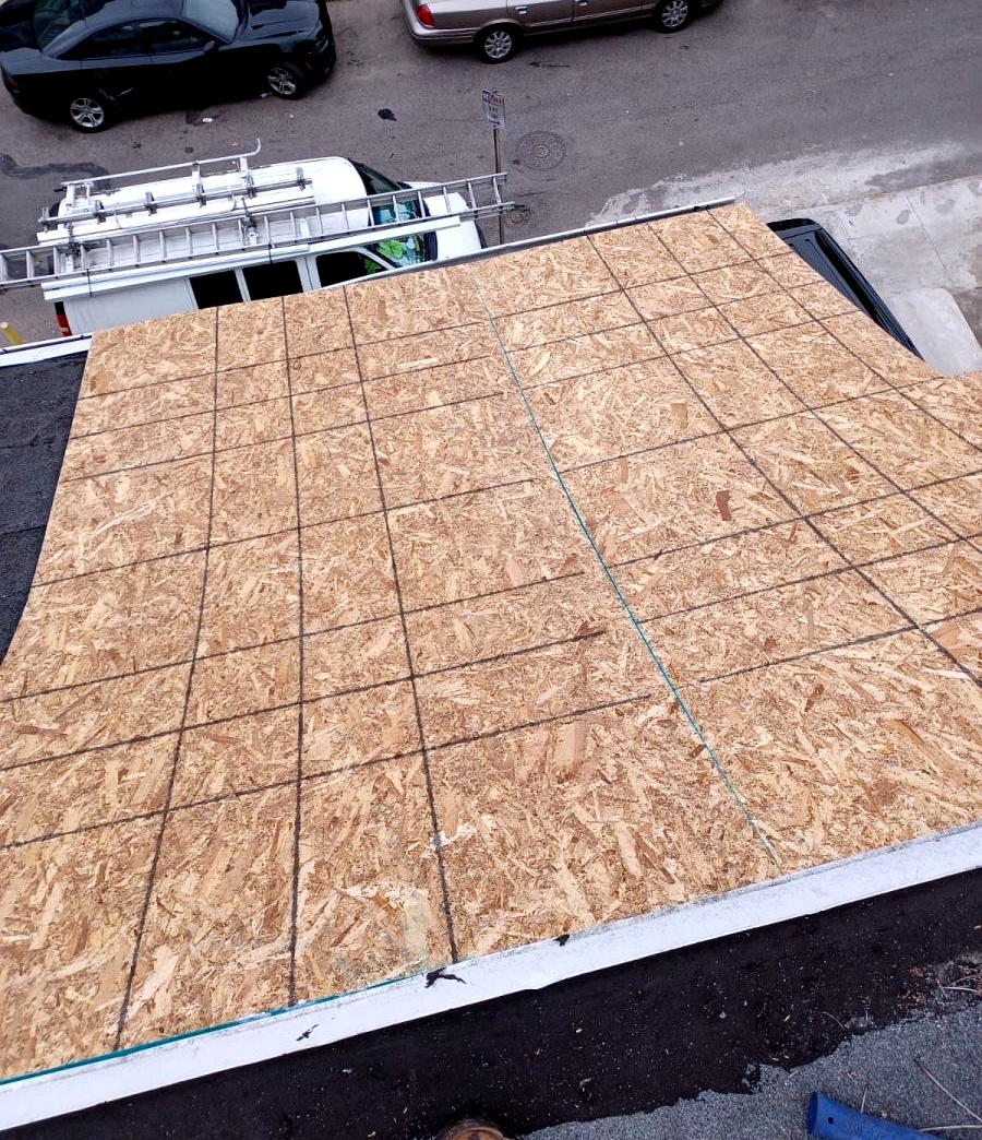 EPDM rubber membrane installation on a Philadelphia row home flat roof. Full tear-off, new decking, and sealed membrane with proper drainage.